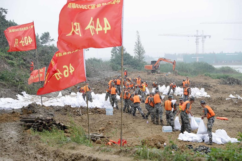 嚴(yán)店鄉(xiāng)蓮花圩派河大堤上,官兵奮戰(zhàn)在抗洪搶險一線。