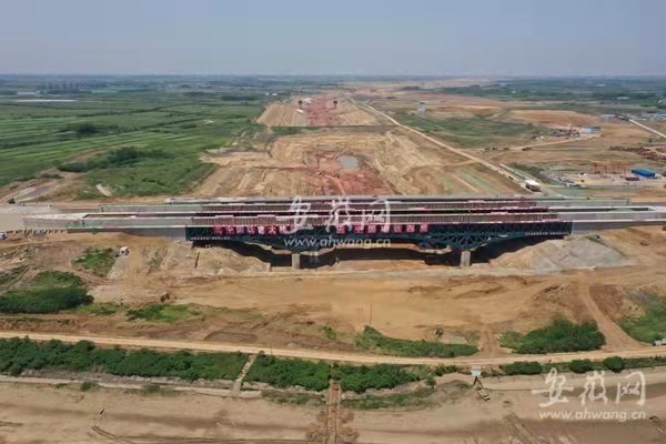 據(jù)介紹,淠河總干渠渡槽工程由中鐵四局和中國鐵建大橋局聯(lián)合承建,是引江濟(jì)淮重大節(jié)點工程。渡槽總長 350 米,分左右兩幅,其中鋼渡槽全長246 米,總用鋼量達(dá) 2.1 萬噸。設(shè)計流量150立方米每秒,設(shè)計水深4.0米,為Ⅵ級航道,通行100噸級船舶。橋跨布置采用 68 米 +110米 +68 米的三跨鋼結(jié)構(gòu)桁架式梁拱組合設(shè)計,主跨跨度達(dá) 110 米,是目前世界上單跨最大的通水通航鋼結(jié)構(gòu)渡槽。渡槽下部為引江濟(jì)淮Ⅱ級航道,兩航道高差約30米。