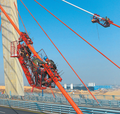 工人在位于安徽省合肥市廬江縣的引江濟(jì)淮文昌西路大橋上安裝斜拉索防護(hù)帶。