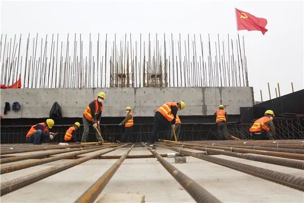 在引江濟淮工程樅陽樞紐節(jié)制閘施工現(xiàn)場,從高處望去,工地上一片繁忙景象,幾臺挖掘機揮動著“機械臂”,戴著安全帽和白色口罩的工人們正在鋪設(shè)鋼筋。